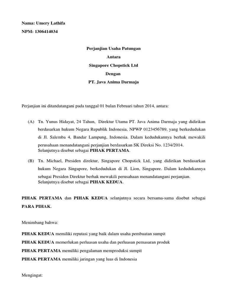 Melihat dari manfaat dan isi surat perjanjian kerja sama usaha di atas, kita tentu sudah dapat menggambarkan poin apa saja yang harus dimasukkan dalam surat perjanjian kerjsa sama usaha. Yang bertanda tangan di bawah ini Surat perjanjian kerjasama usaha perorangan memuat bukti tertulis mengenai kolaborasi maupun kerjasama kemitraan usaha dalam cakupan perorangan. Contoh surat perjanjian kerjasama dalam bisnis jasa usaha dan investasi bila saat ini anda sedang atau mau menjalin sebuah usahabisnis dengan rekanteman anda maka buatlah sebuah perjanjian tertulis. Contoh surat perjanjian kerjasama usaha perdagangan.